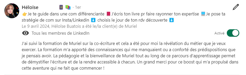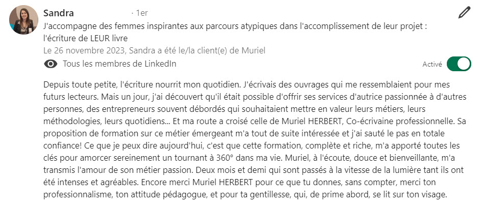 Il s'agit de créer un ouvrage pour le compte de quelqu'un. Très souvent, les personnes à qui je m'adresse manquent de temps et/ou ne savent pas écrire, ou n'aiment pas ça. Ces personnes et moi, on réunit nos compétences pour en faire un livre.